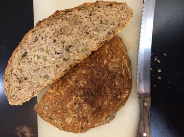 There are many recipes for no knead bread on the internet, and this is my favourite so far. It is a mixture of wholemeal and white bread flour, with lots and lots of seeds. It is perfect for open sandwiches. As a household of two, I cut the fresh loaf in half, wrap one half in foil and put it into the freezer. The other half will last for three meals, and is lovely topped with butter (or equivalent), cheese and tomatoes. Because there is no fat in this bread, it tends to dry out, so by the third day I need more moisture-rich toppings. Ideal options are eggs mashed in mayonnaise with chopped cherry tomatoes, use peanut butter and cover with slices of banana, or toast and top with mashed avocados. I am sure you can come up with more options here.